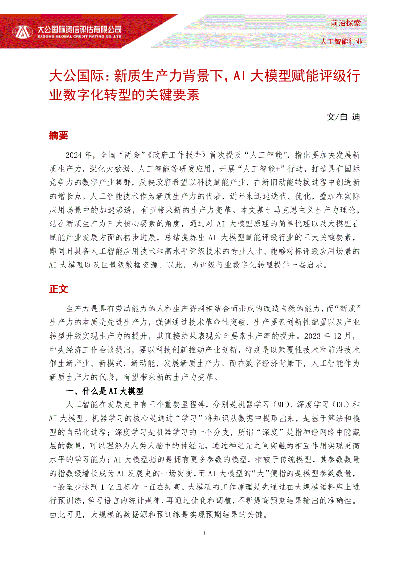 人工智能行业:大公国际-人工智能行业:新质生产力背景下,AI大模型赋能评级行业数字化转型的关键要素-240315