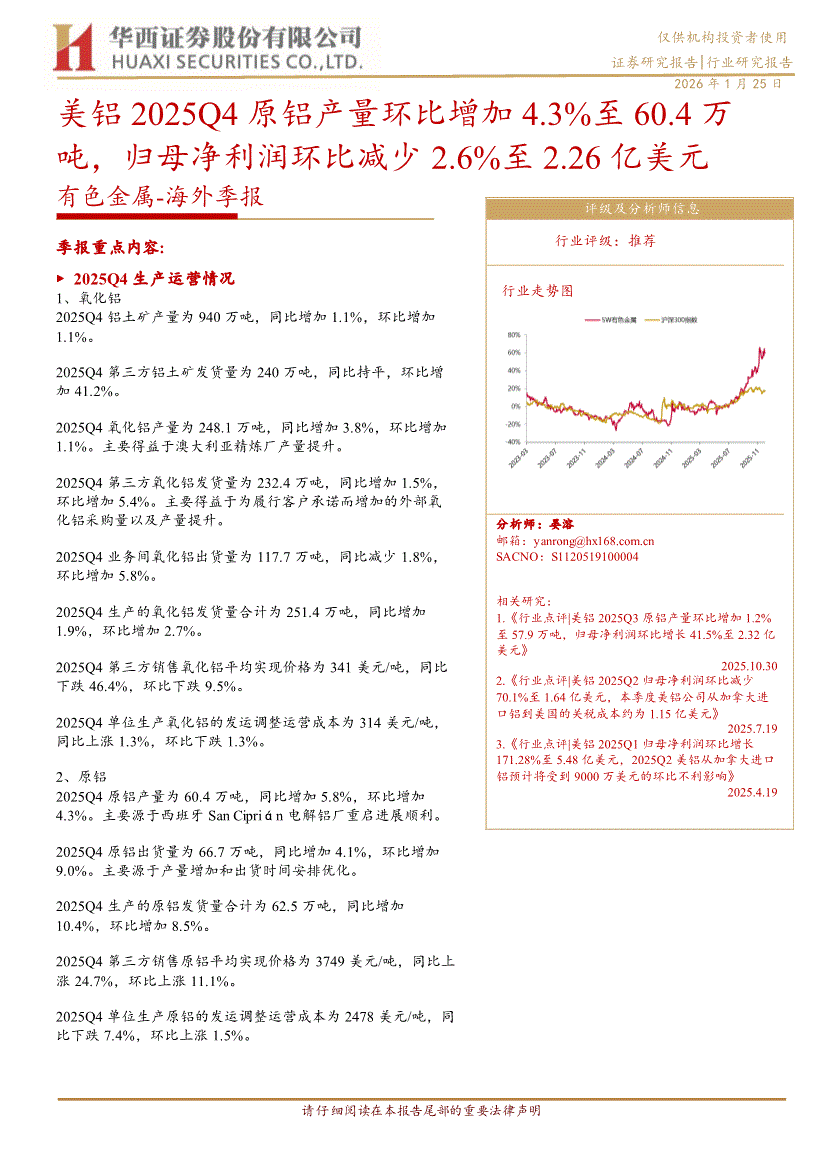 有色金属行业:华西证券-有色金属行业~海外季报:美铝2025Q4原铝产量环比增加4.3%至60.4万吨,归母净利润环比减少2.6%至2.26亿美元-260125