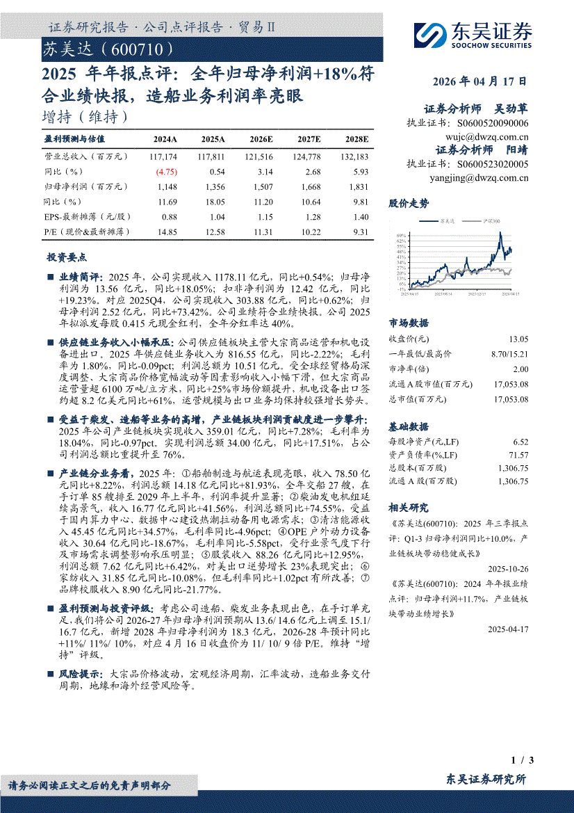 苏美达:东吴证券-苏美达-600710-2025年年报点评:全年归母净利润+18%符合业绩快报,造船业务利润率亮眼-260417