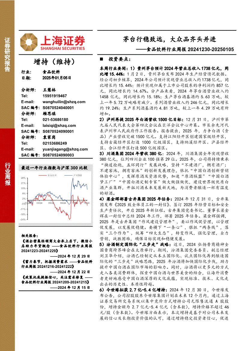 食品饮料行业:上海证券-食品饮料行业周报:茅台行稳致远,大众品齐头并进-250105