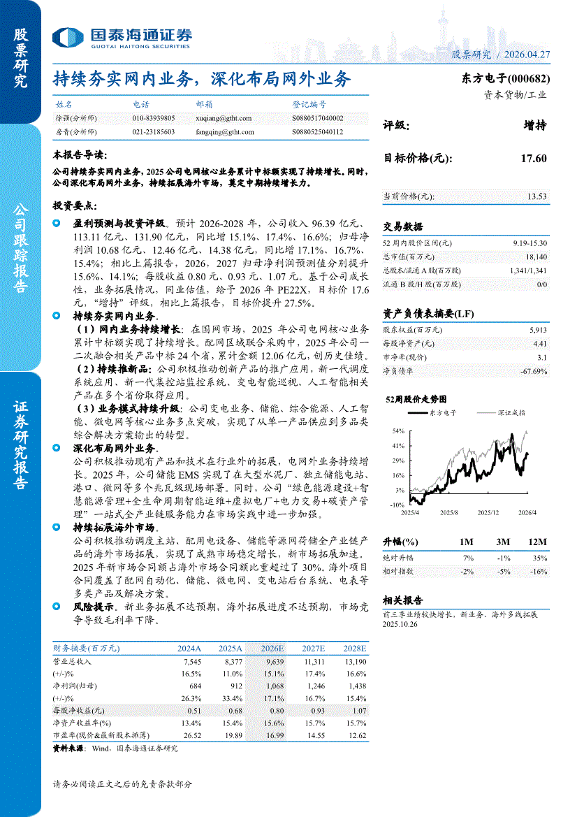 东方电子:国泰海通证券-东方电子-000682-持续夯实网内业务,深化布局网外业务-260427