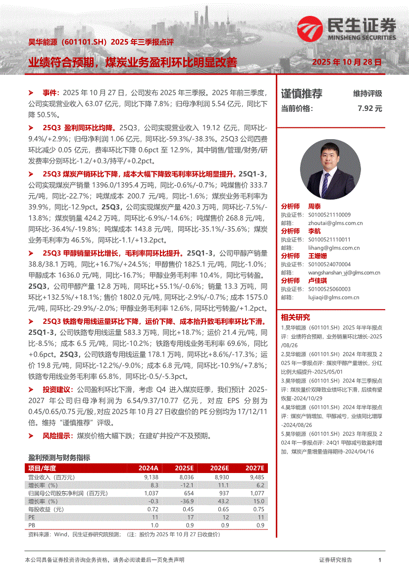 昊华能源:民生证券-昊华能源-601101-2025年三季报点评:业绩符合预期,煤炭业务盈利环比明显改善-251028
