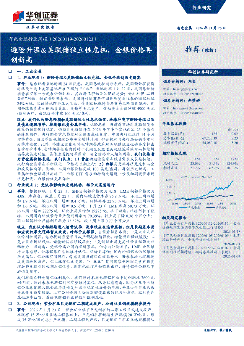 有色金属行业:华创证券-有色金属行业周报:避险升温&美联储独立性危机,金银价格再创新高-260125