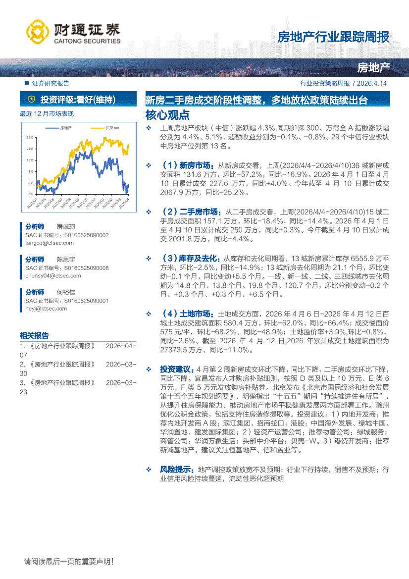 房地产行业:财通证券-房地产行业跟踪周报:新房二手房成交阶段性调整,多地放松政策陆续出台-260414