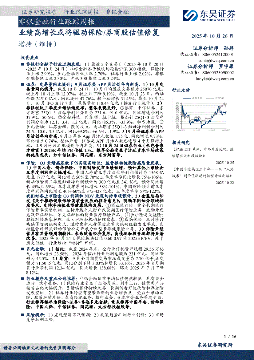 非银金融行业:东吴证券-非银金融行业跟踪周报:业绩高增长或将驱动保险/券商股估值修复-251026