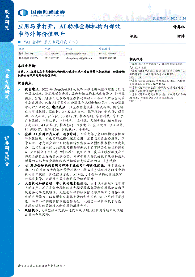 计算机行业:国泰海通证券-计算机行业“AI+金融”系列专题研究(二):应用场景打开,AI助推金融机构内部效率与外部价值双升-251124