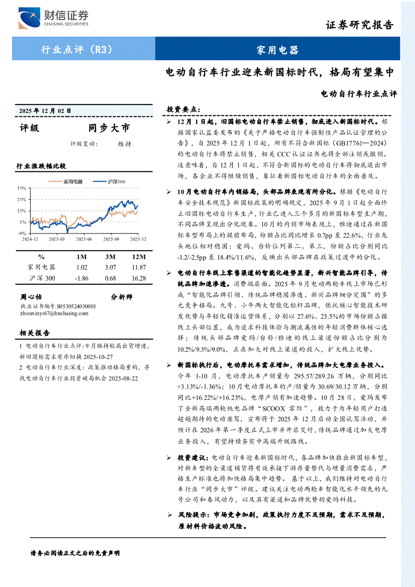 电动自行车行业:财信证券-电动自行车行业点评:电动自行车行业迎来新国标时代,格局有望集中-251202