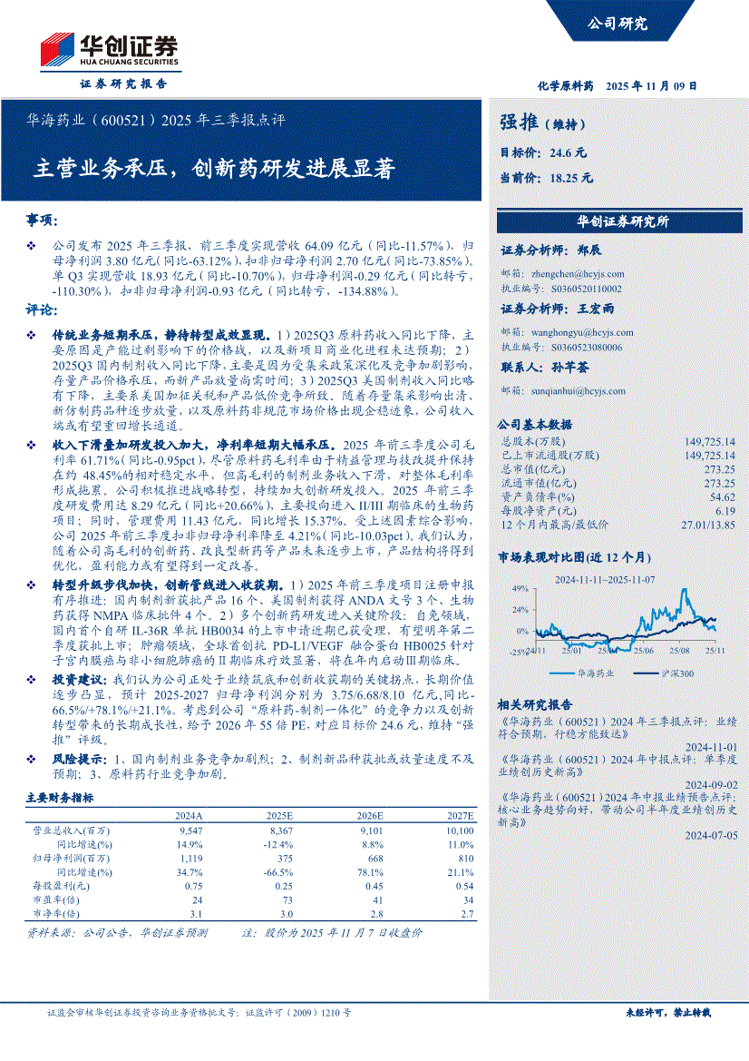 华海药业:华创证券-华海药业-600521-2025年三季报点评:主营业务承压,创新药研发进展显著-251109