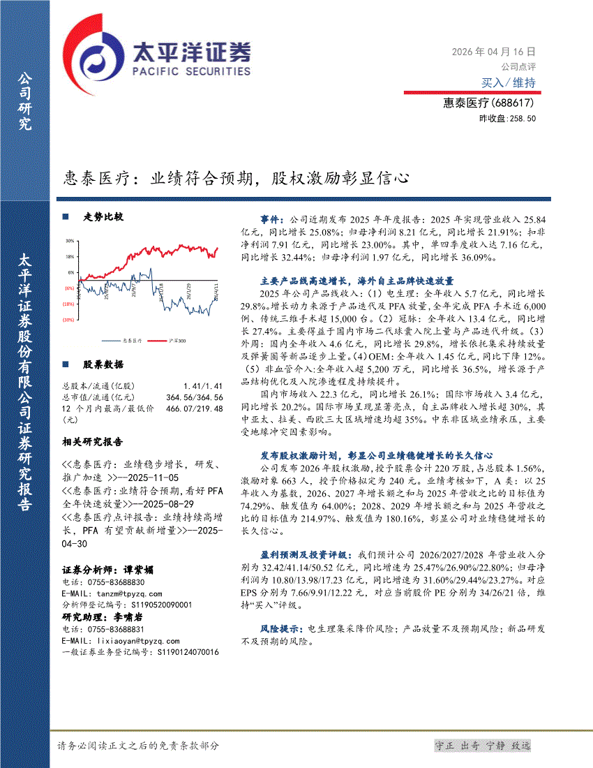 惠泰医疗:太平洋证券-惠泰医疗-688617-业绩符合预期,股权激励彰显信心-260416