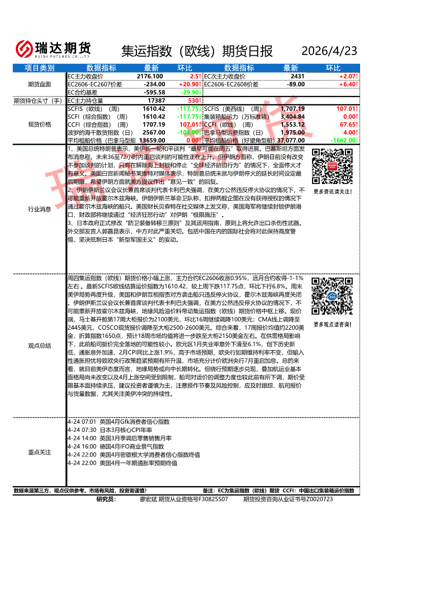 瑞达期货-集运指数(欧线)期货日报-260423