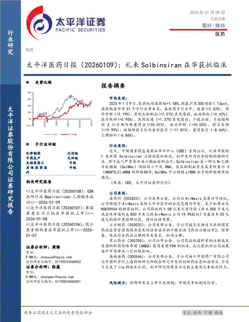 医药行业:太平洋证券-医药行业日报:礼来solbinsiran在华获批临床-260109