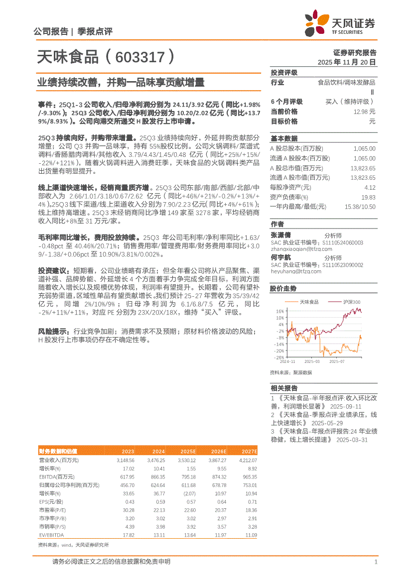 天味食品:天风证券-天味食品-603317-业绩持续改善,并购一品味享贡献增量-251120