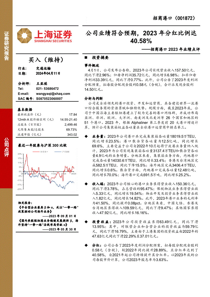 招商港口:上海证券-招商港口-001872-2023年业绩点评:公司业绩符合预期,2023年分红比例达40.58%-240411