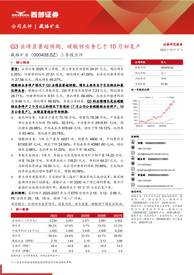 西部证券-藏格矿业-000408-三季报点评:Q3业绩显著超预期,碳酸锂业务已于10月初复产-251017