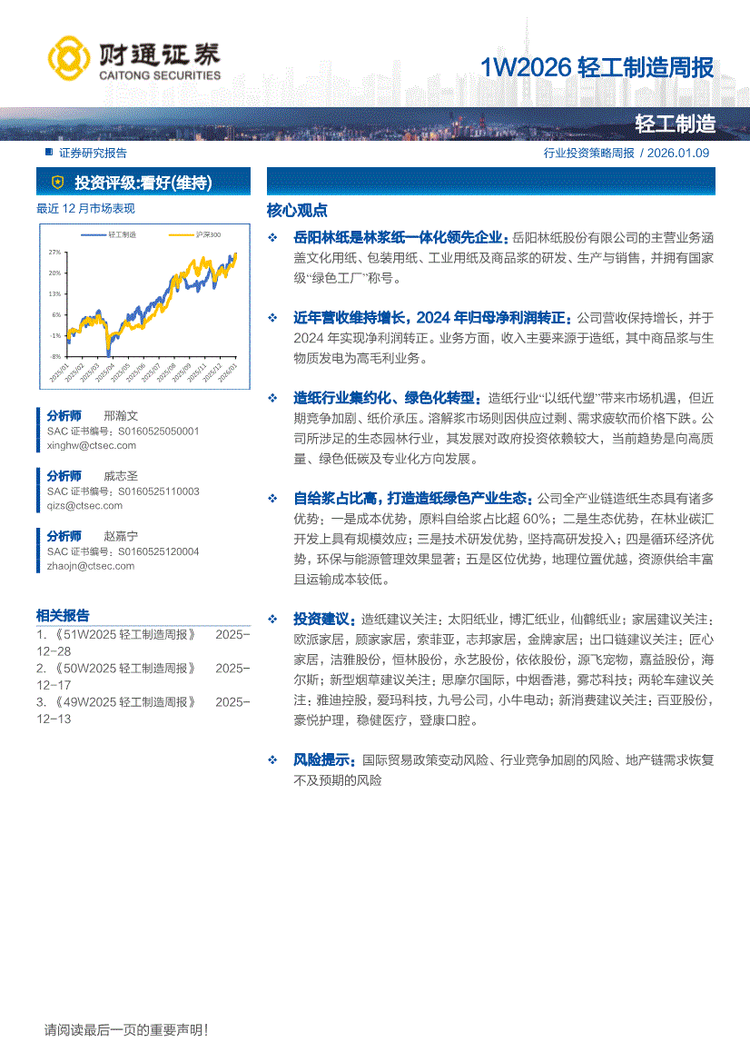 轻工制造行业:财通证券-1W2026轻工制造行业周报-260109