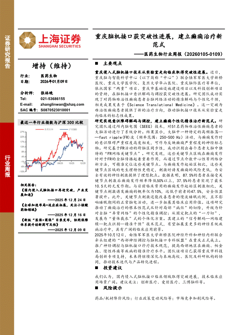 医药生物行业:上海证券-医药生物行业周报:重庆脑机接口获突破性进展,建立癫痫治疗新范式-260109