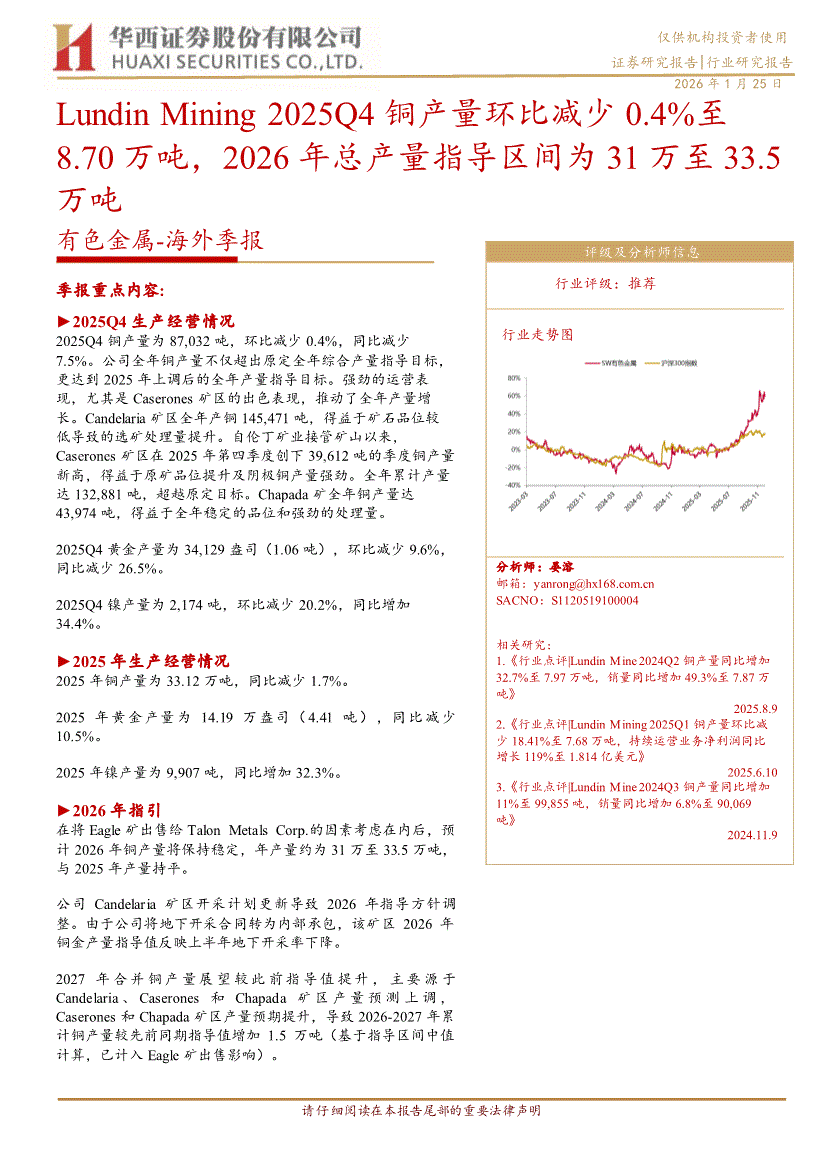 有色金属行业:华西证券-有色金属行业~海外季报:Lundin Mining 2025Q4铜产量环比减少0.4%至8.70万吨,2026年总产量指导区间为31万至33.5万吨-260125