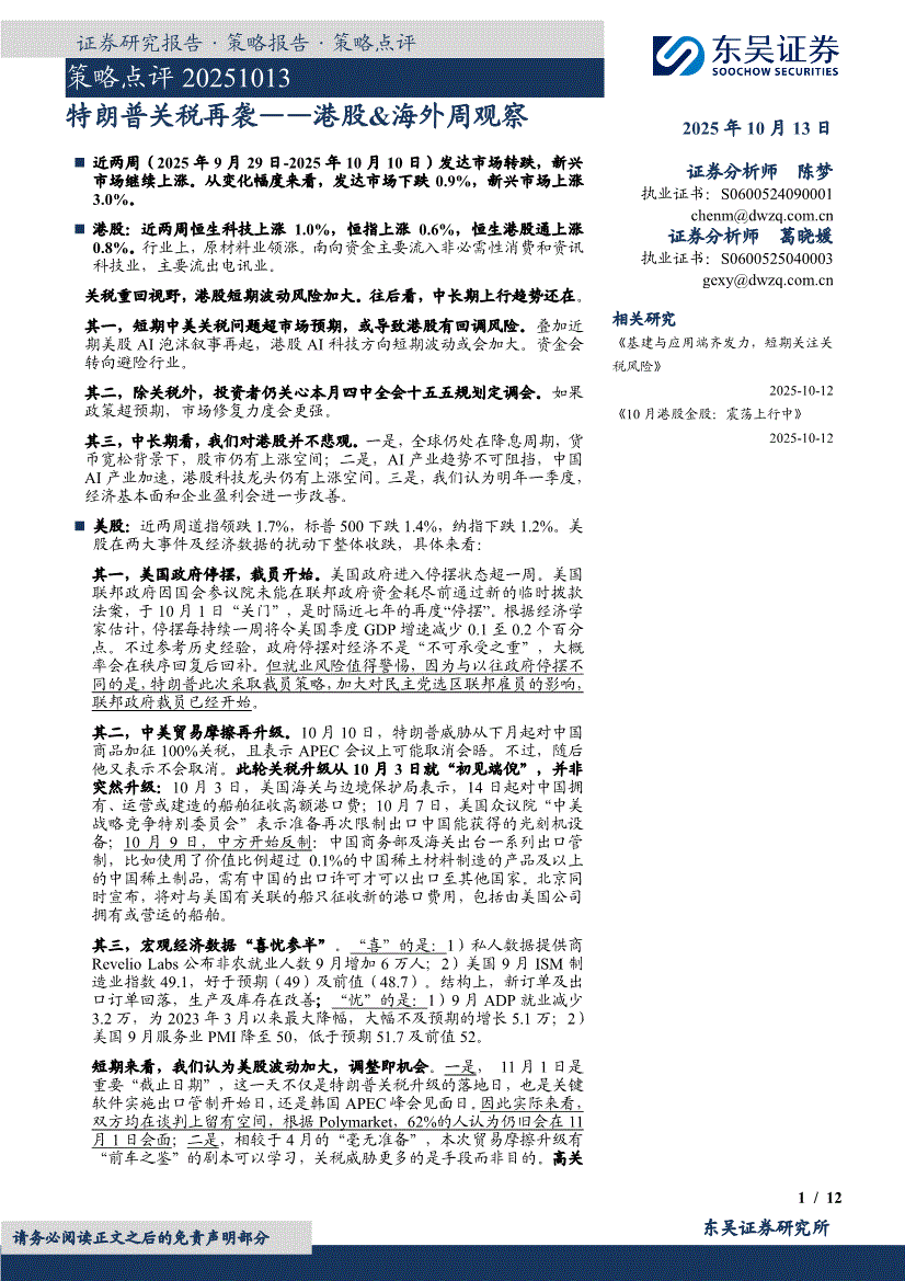 东吴证券-港股&海外周观察:特朗普关税再袭-251013