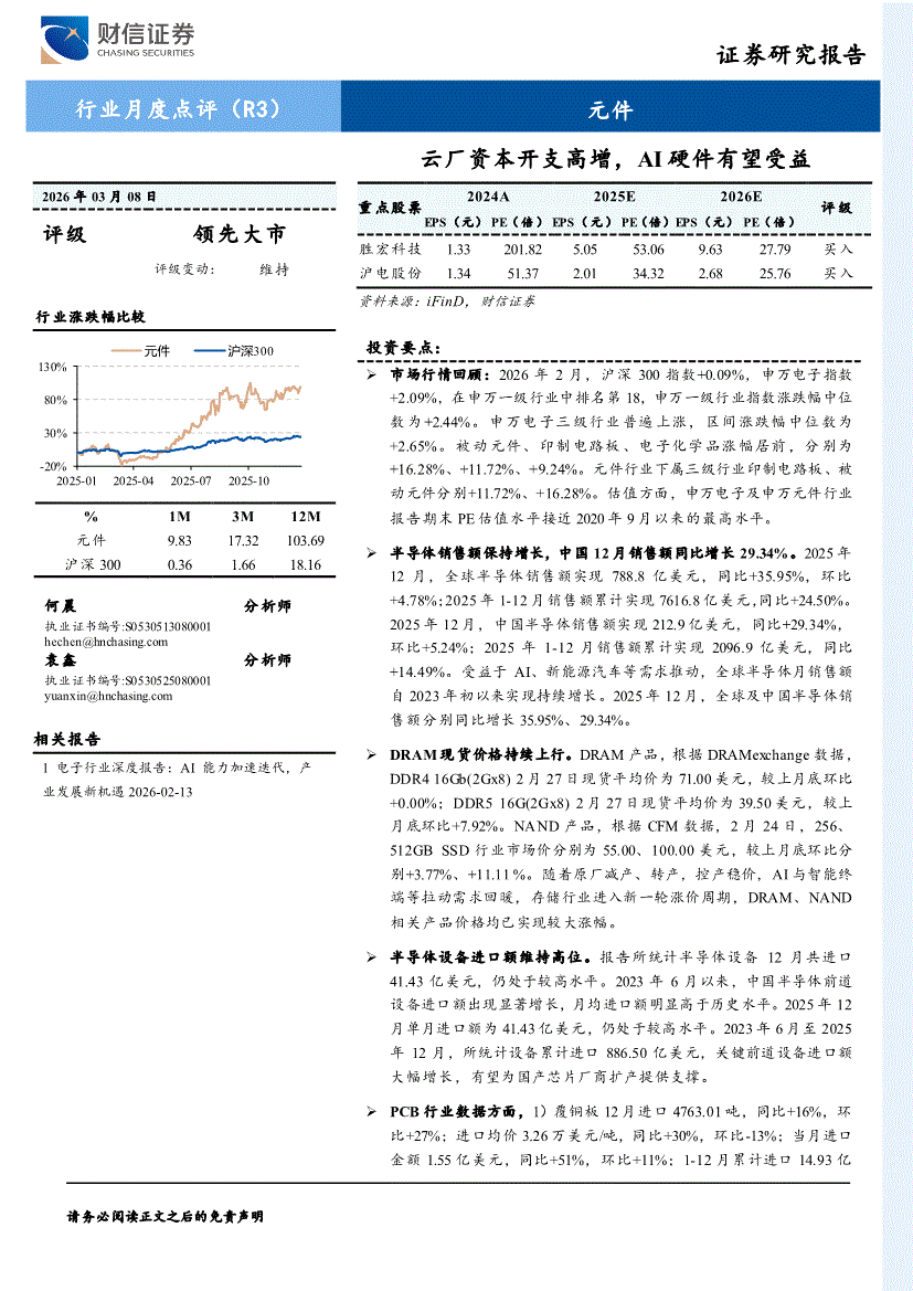 元件行业:财信证券-元件行业月度点评(R3):云厂资本开支高增,AI硬件有望受益-260308