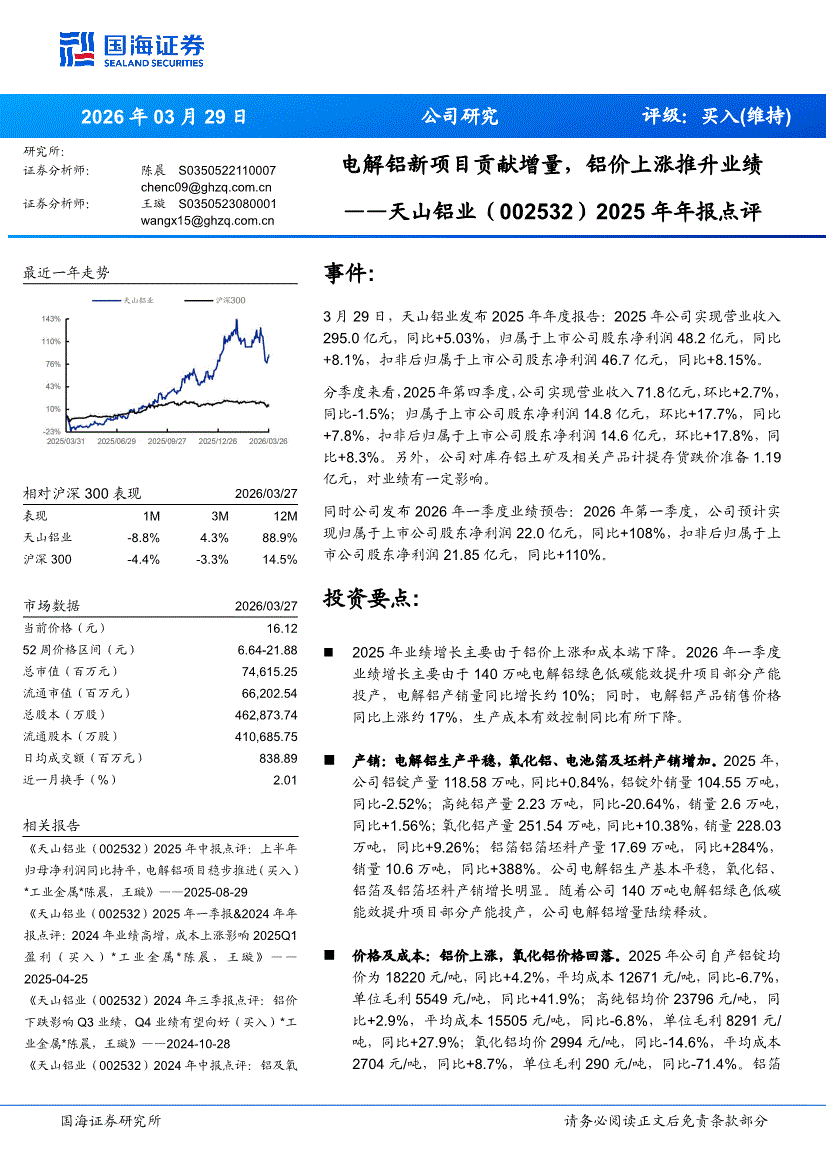 天山铝业:国海证券-天山铝业-002532-2025年年报点评:电解铝新项目贡献增量,铝价上涨推升业绩-260329