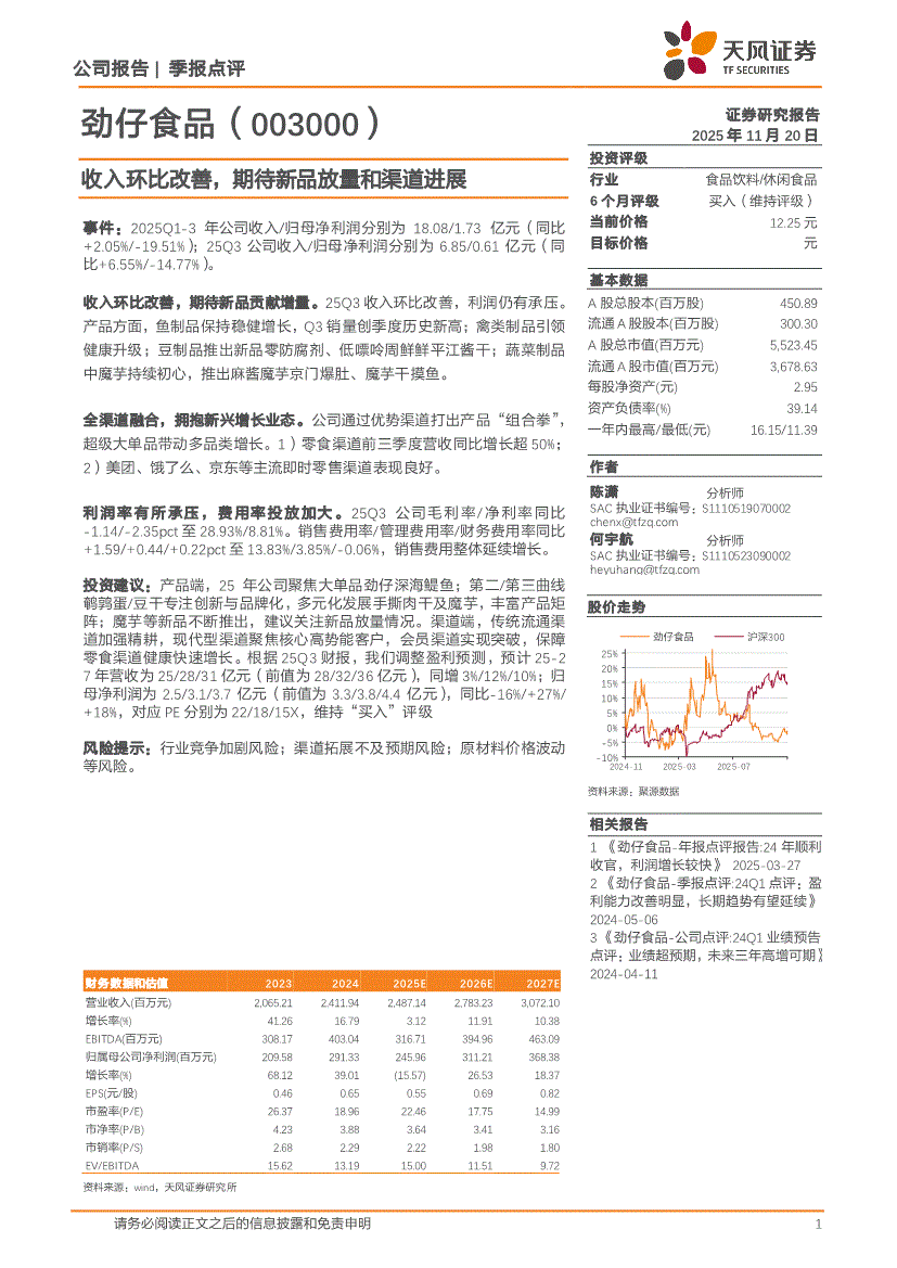 劲仔食品:天风证券-劲仔食品-003000-收入环比改善,期待新品放量和渠道进展-251120