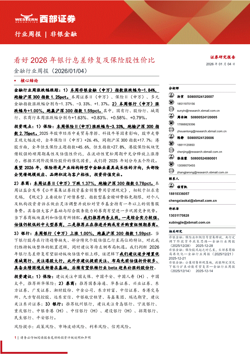 金融行业:西部证券-金融行业周报:看好2026年银行息差修复及保险股性价比-260104