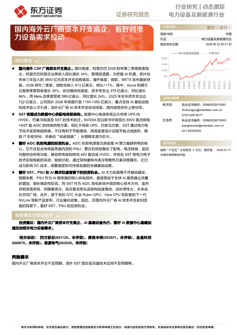 电力设备及新能源行业:东方证券-电力设备及新能源行业动态跟踪:国内海外云厂商资本开支高企,看好对电力设备需求拉动-260201