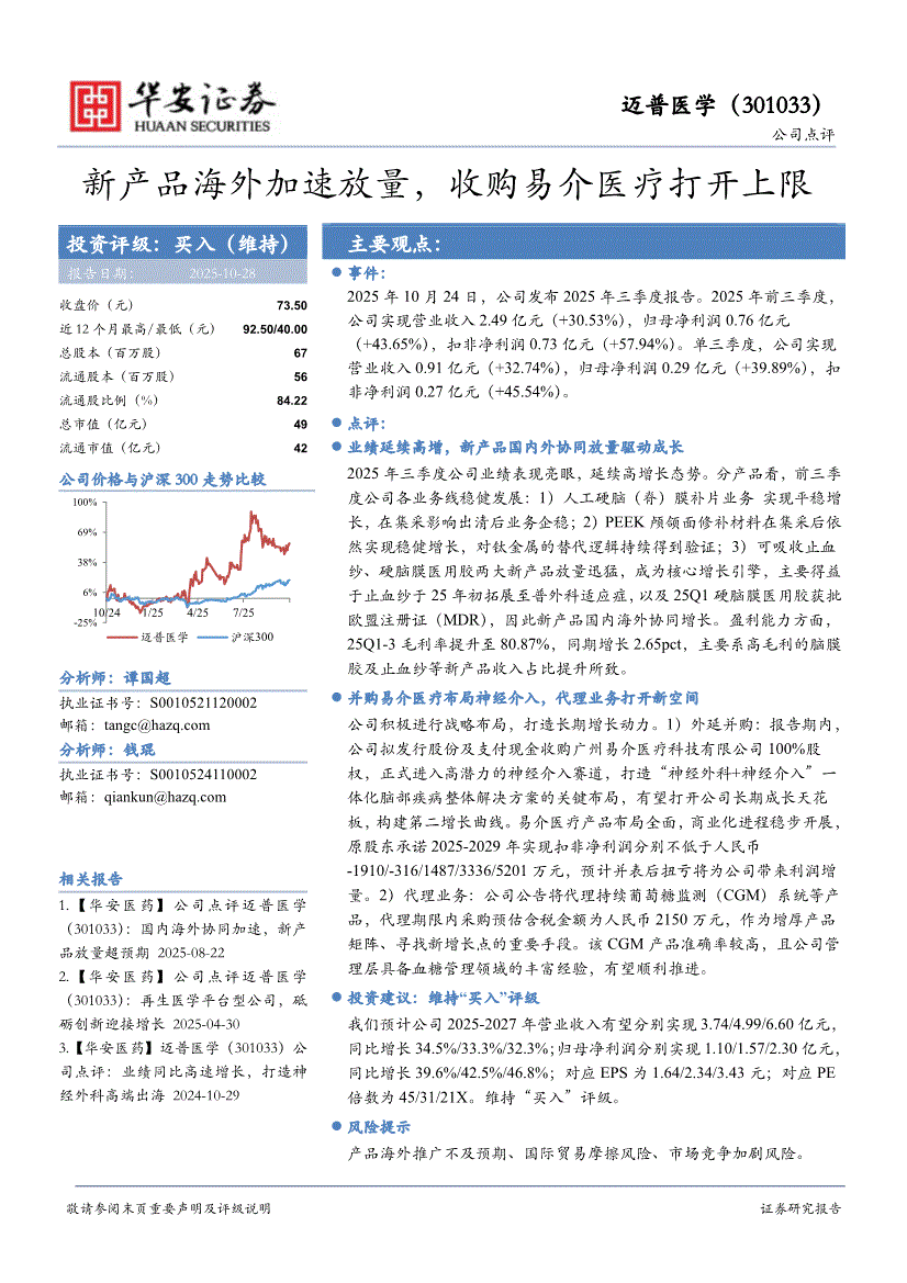 迈普医学:华安证券-迈普医学-301033-新产品海外加速放量,收购易介医疗打开上限-251028