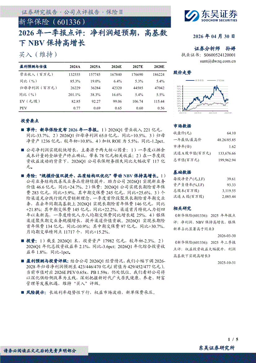 新华保险:东吴证券-新华保险-601336-2026年一季报点评:净利润超预期,高基数下NBV保持高增长-260430