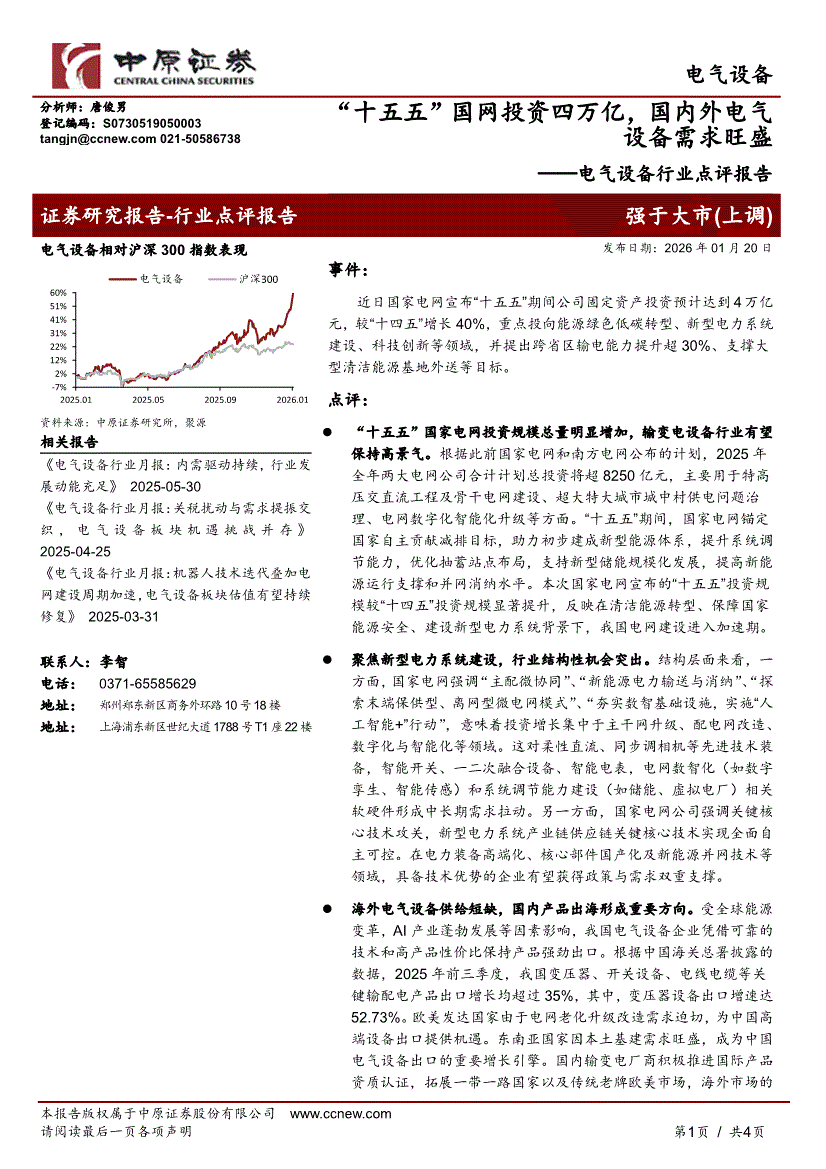 电气设备行业:中原证券-电气设备行业点评报告:“十五五”国网投资四万亿,国内外电气设备需求旺盛-260120