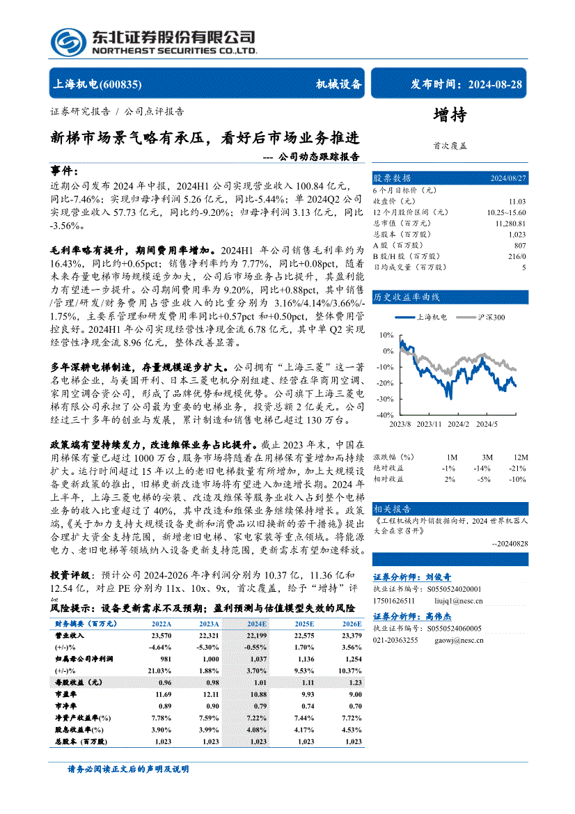上海机电:东北证券-上海机电-600835-公司动态跟踪报告:新梯市场景气略有承压,看好后市场业务推进-240828