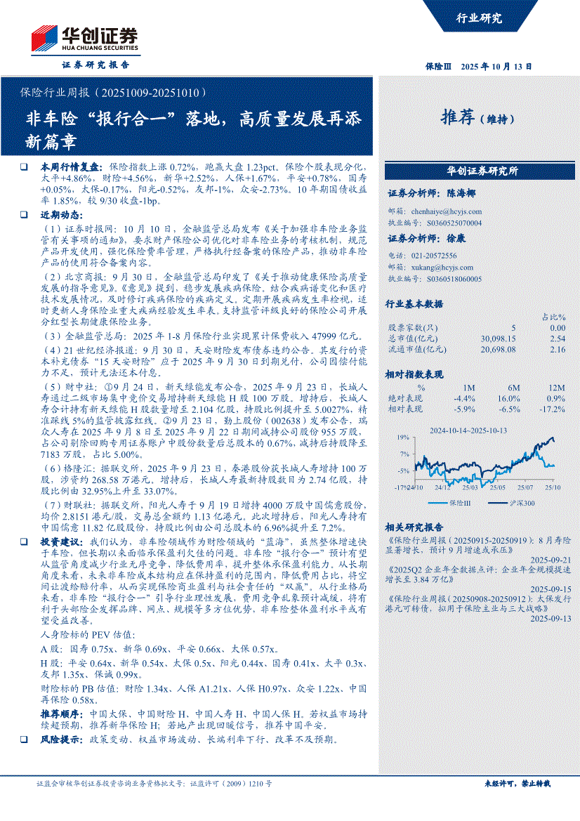 保险行业:华创证券-保险行业周报:非车险“报行合一”落地,高质量发展再添新篇章-251013