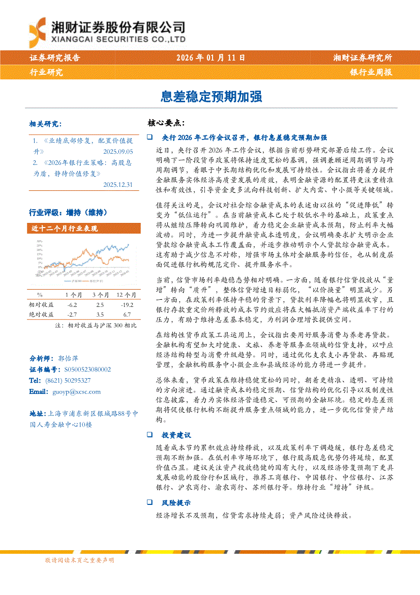 银行业:湘财证券-银行业周报:息差稳定预期加强-260111