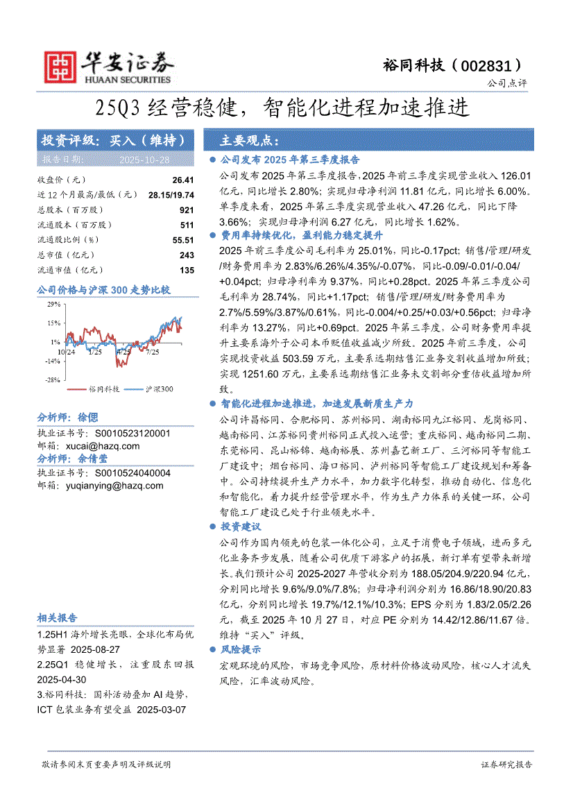 裕同科技:华安证券-裕同科技-002831-25Q3经营稳健,智能化进程加速推进-251028