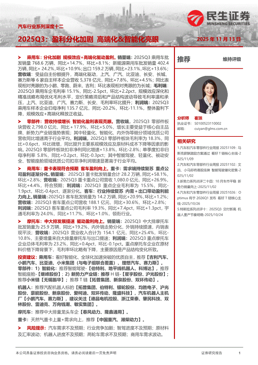 汽车行业:民生证券-汽车行业系列深度十二:2025Q3,盈利分化加剧,高端化&智能化亮眼-251113