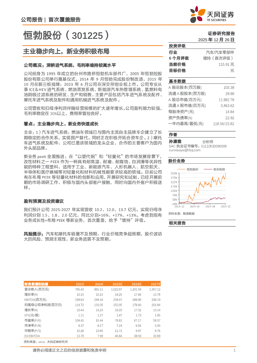 恒勃股份:天风证券-恒勃股份-301225-主业稳步向上,新业务积极布局-251226