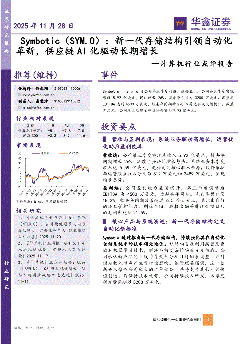 计算机行业:华鑫证券-计算机行业点评报告:Symbotic(SYM.O),新一代存储结构引领自动化革新,供应链AI化驱动长期增长-251128