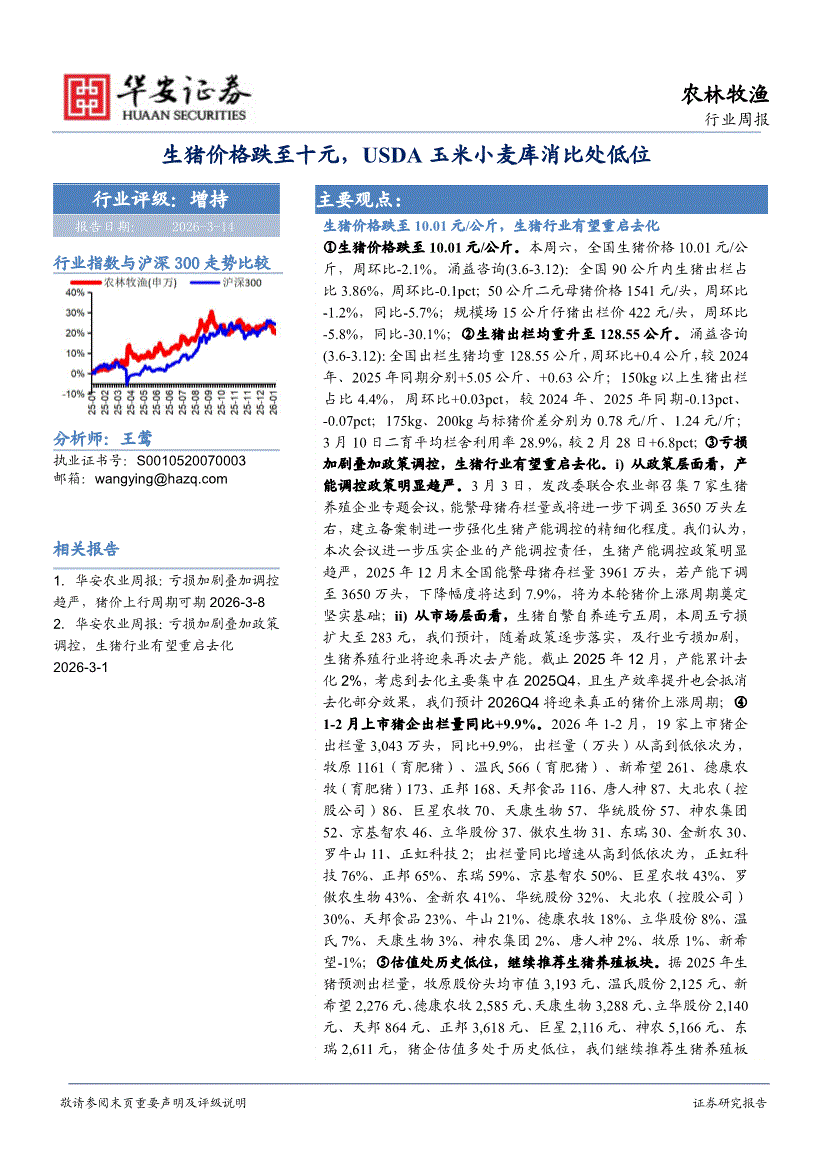 农林牧渔行业:华安证券-农林牧渔行业周报:生猪价格跌至十元,USDA玉米小麦库消比处低位-260314