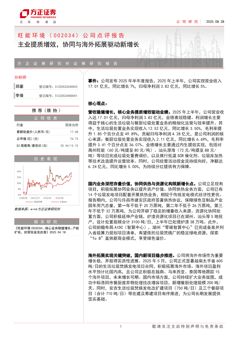 旺能环境:方正证券-旺能环境-002034-公司点评报告:主业提质增效,协同与海外拓展驱动新增长-250828