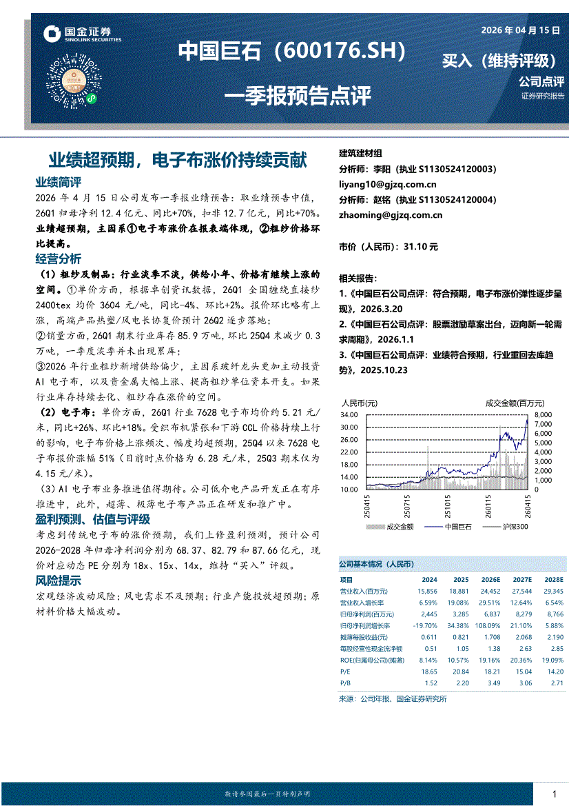 中国巨石:国金证券-中国巨石-600176-一季报预告点评:业绩超预期,电子布涨价持续贡献-260415