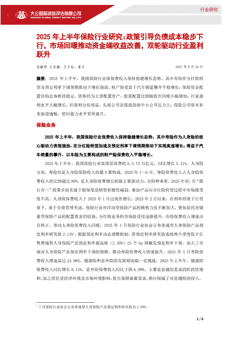 保险行业:大公国际-2025年上半年保险行业研究:政策引导负债成本稳步下行,市场回暖推动资金端收益改善,双轮驱动行业盈利跃升-250826