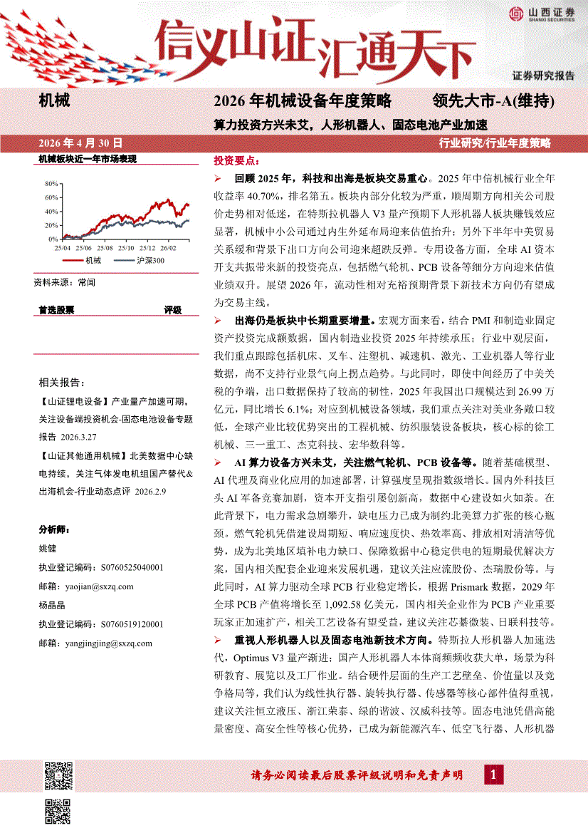 机械行业:山西证券-2026年机械设备行业年度策略:算力投资方兴未艾,人形机器人、固态电池产业加速-260430
