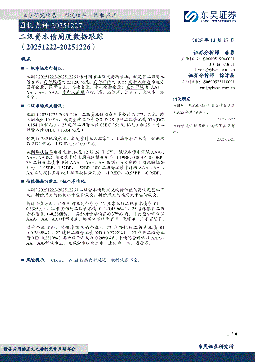 东吴证券-固收点评:二级资本债周度数据跟踪(20251222~20251226)-251227