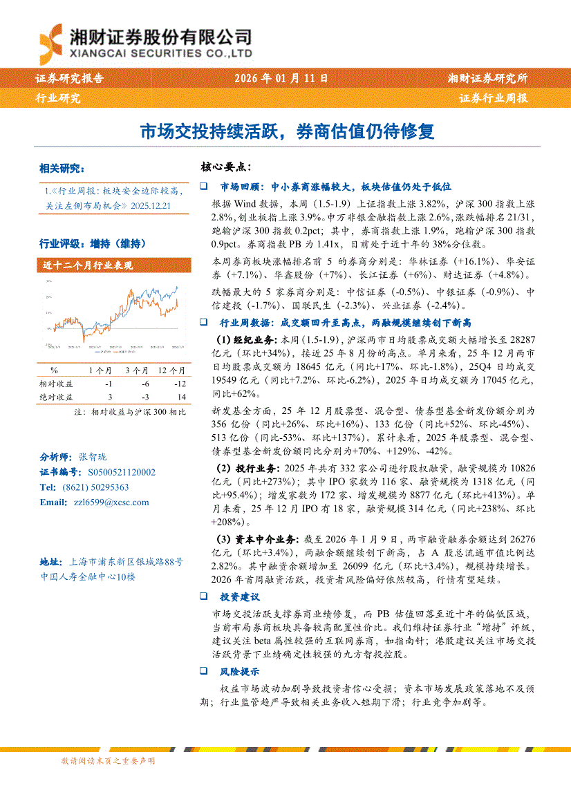 证券行业:湘财证券-证券行业周报:市场交投持续活跃,券商估值仍待修复-260111