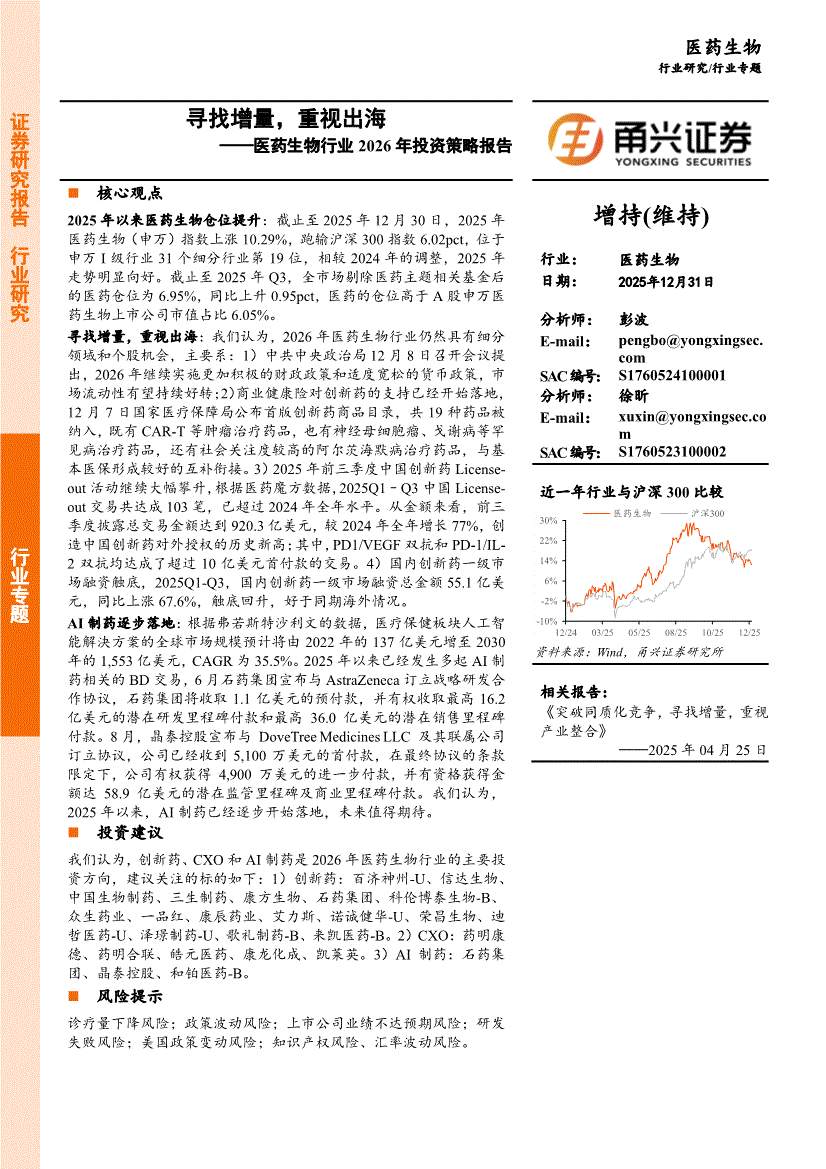 医药生物行业:甬兴证券-医药生物行业2026年投资策略报告:寻找增量,重视出海-251231