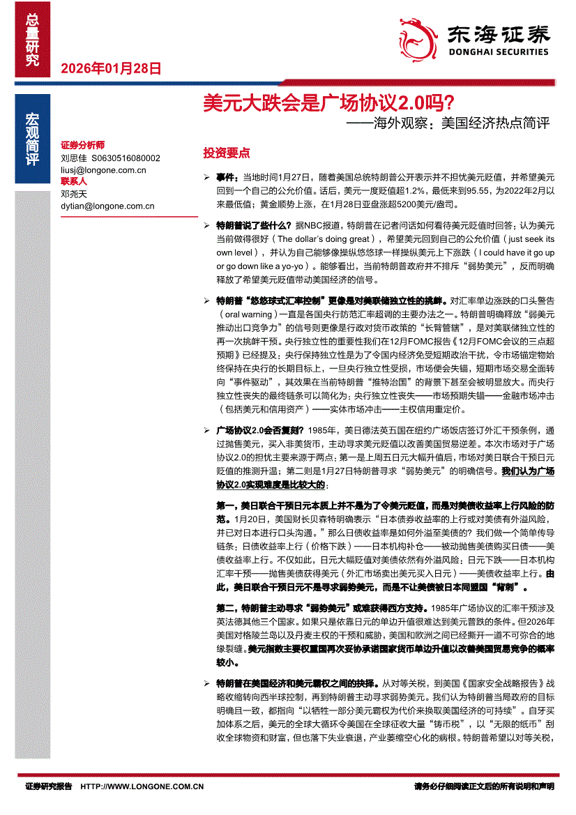 东海证券-海外观察:美国经济热点简评,美元大跌会是广场协议2.0吗?-260128