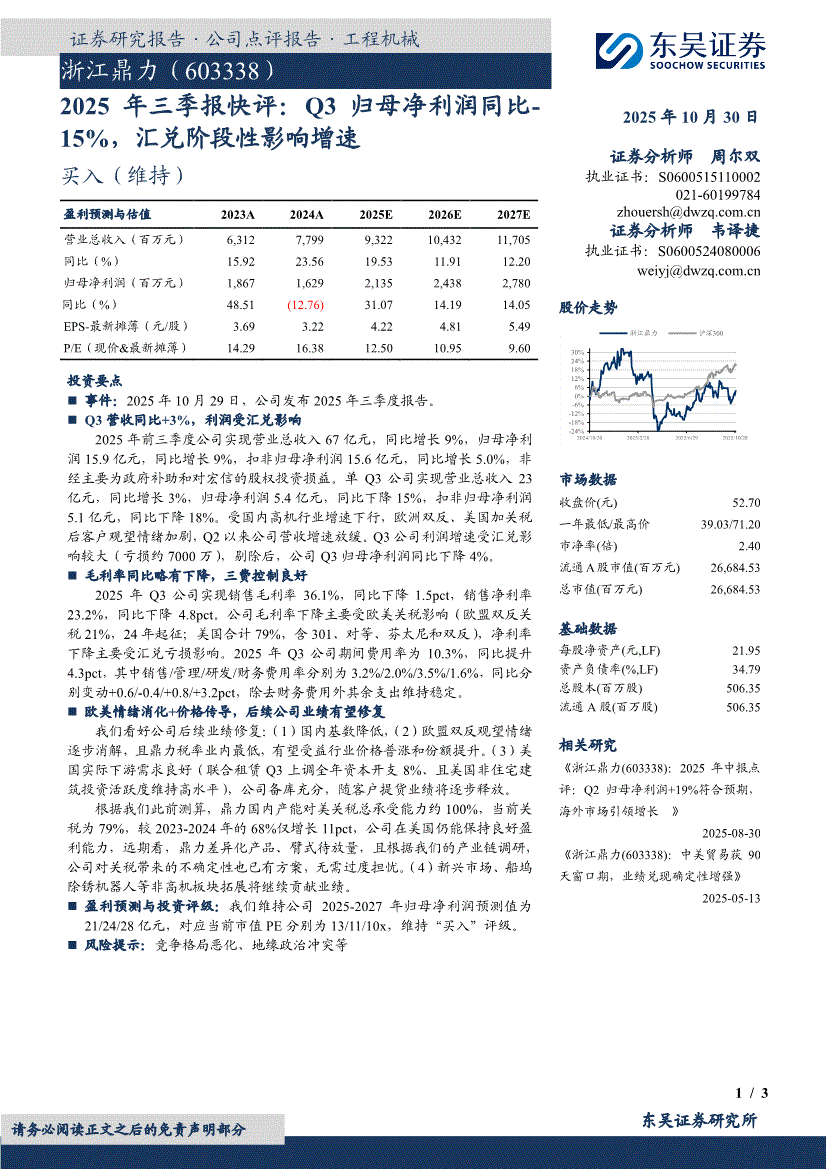 浙江鼎力:东吴证券-浙江鼎力-603338-2025年三季报快评:Q3归母净利润同比下降15%,汇兑阶段性影响增速-251030