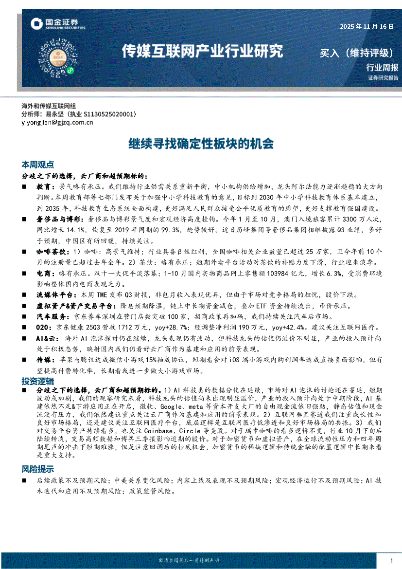 传媒互联网行业:国金证券-传媒互联网产业行业周报:继续寻找确定性板块的机会-251116