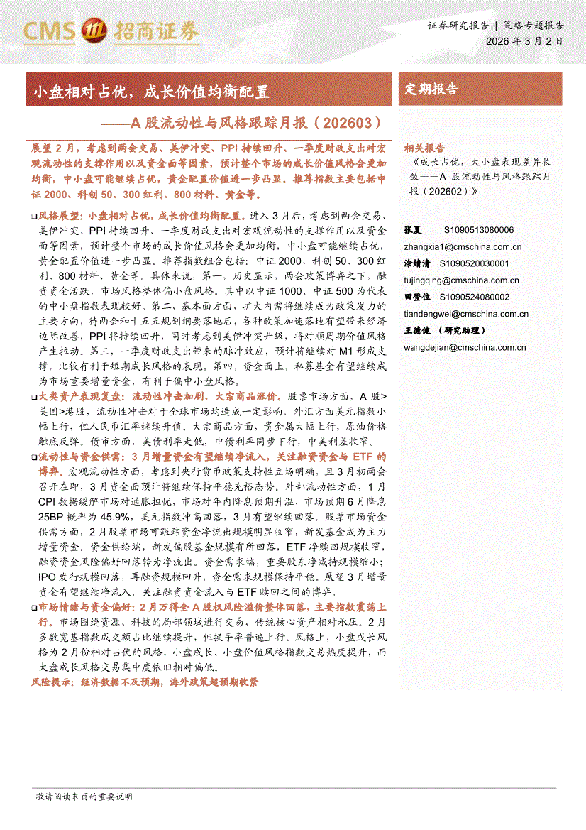 招商证券-A股流动性与风格跟踪月报:小盘相对占优,成长价值均衡配置-260302