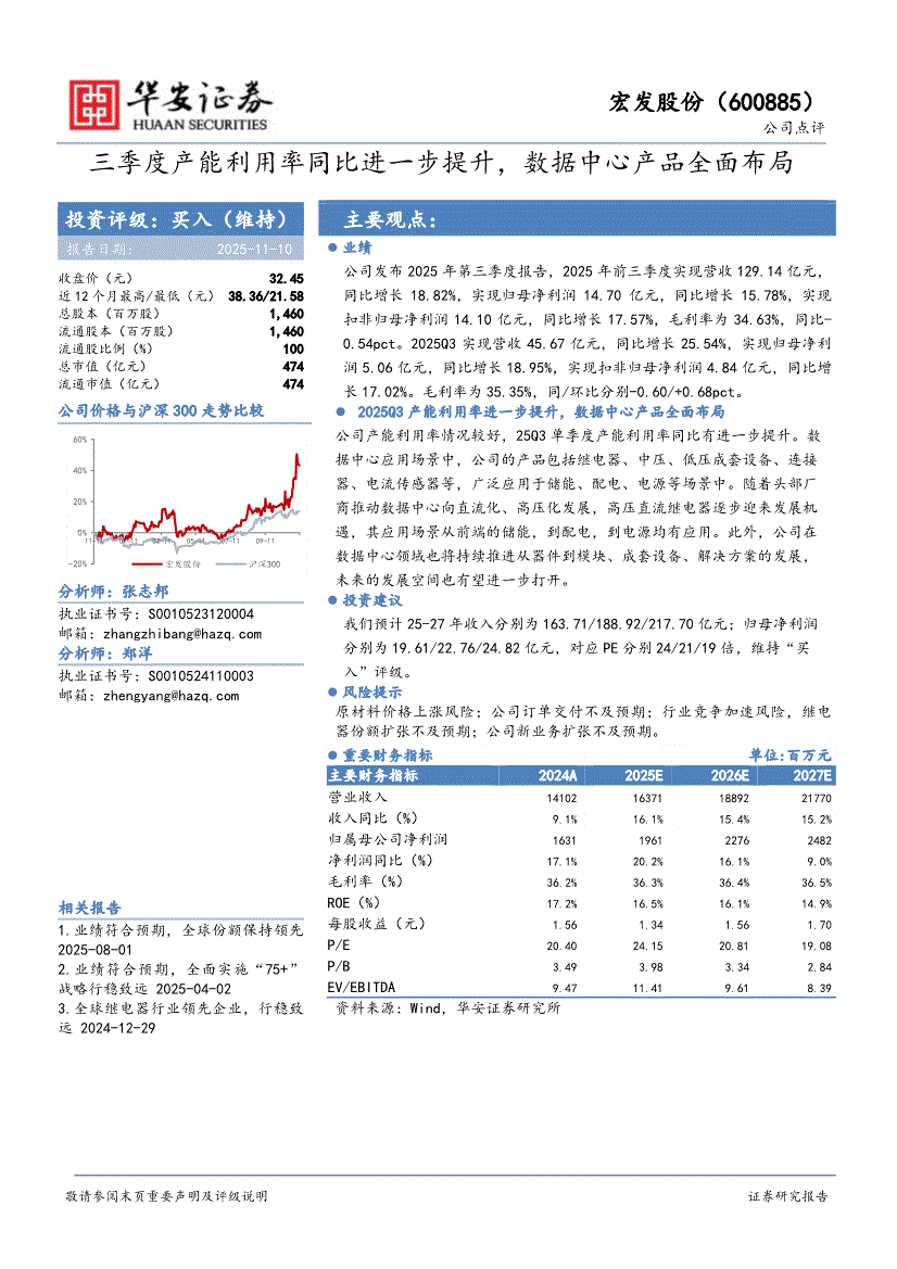 宏发股份:华安证券-宏发股份-600885-三季度产能利用率同比进一步提升,数据中心产品全面布局-251110